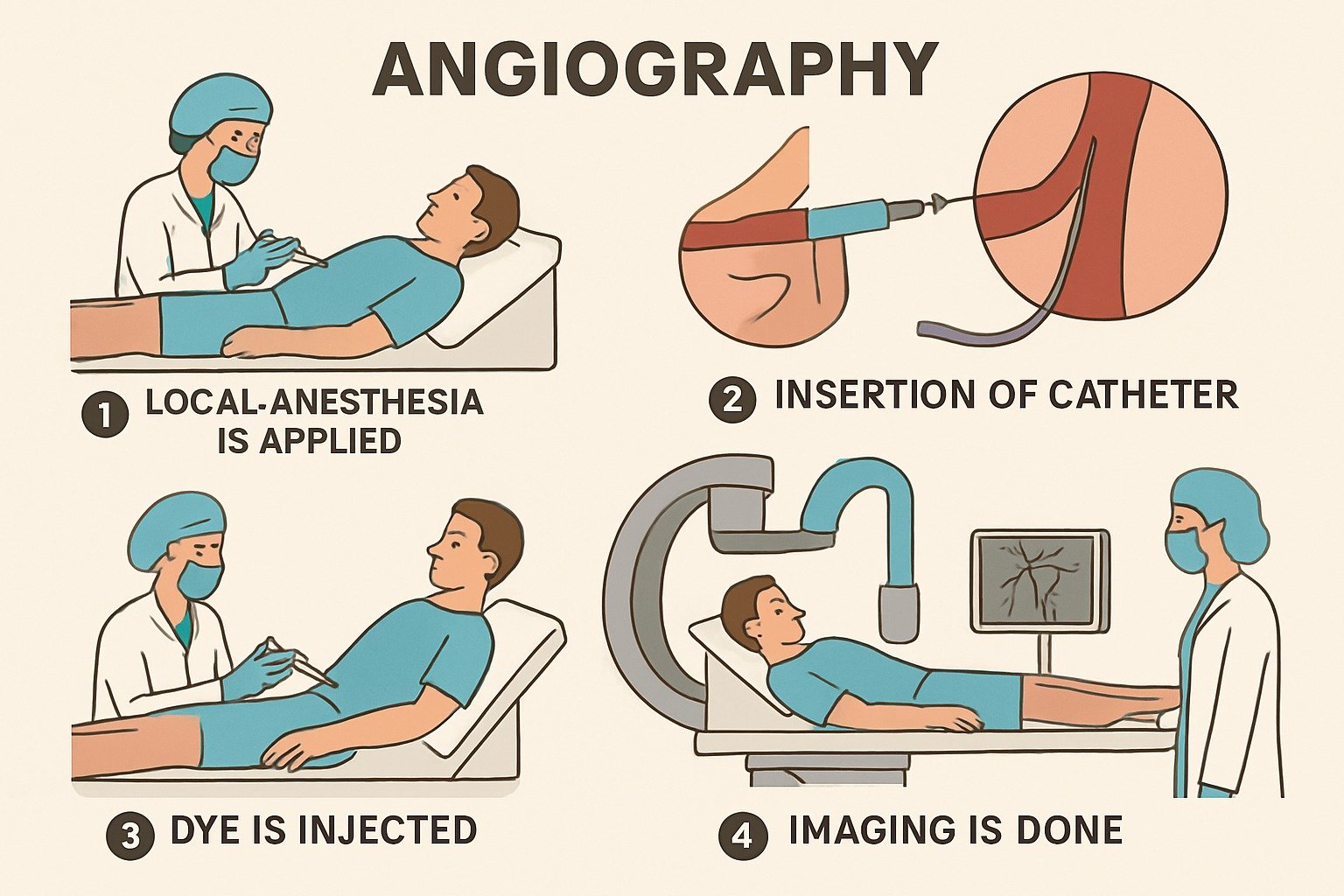 Angiography is a painless, minimally invasive procedure that helps doctors see blockages or narrowing in your blood vessels. During the test, you will be asked to lie on a table inside a special X-ray room. The doctor will clean and numb the area—usually the wrist or groin—where the catheter will be inserted.